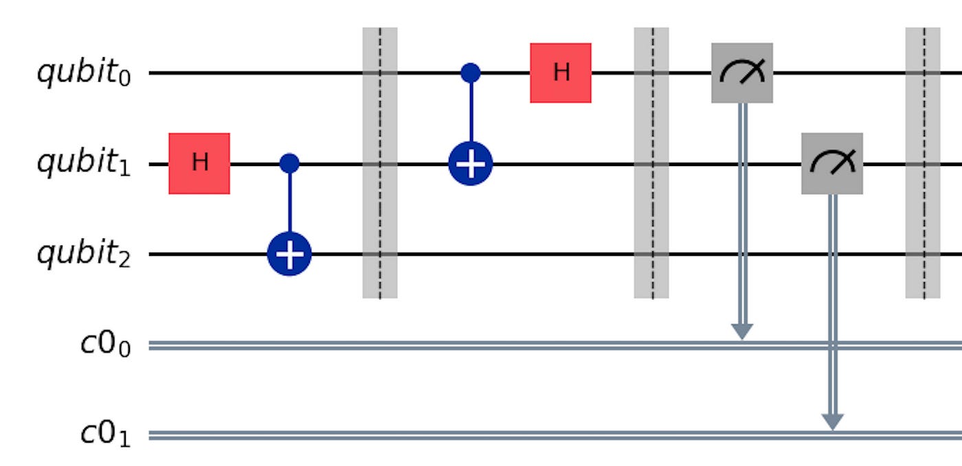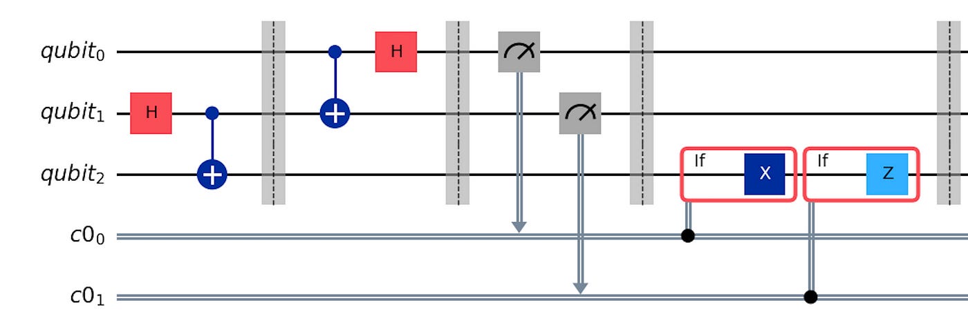 After the measurement of first two qubits, we will send the outcomes to qubit2. Based on that, qubit2 applies quantum gate to it’s qubit. Let’s understand mathematically now.