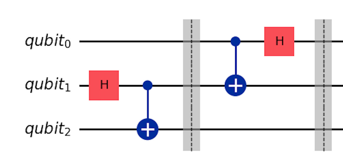 Ok let’s realize the teleportation circuit. We have 3 qubits in total, as shown below, Qubit0 has unknown state and needs to be teleported to qubit2. First, we need to generate entangled state (bell state) using Hadamard and C-NOT gate on qubit1 and qubit2 and then we apply teleportation protocol as shown in below.