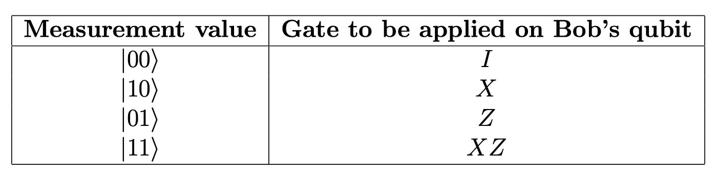 Now we perform the measurement on the first qubit and with respect to the outcome, we will apply respective gate’s on the second qubit. The protocol goes as below in table, where qubit2 is referred as Bob’s qubit.